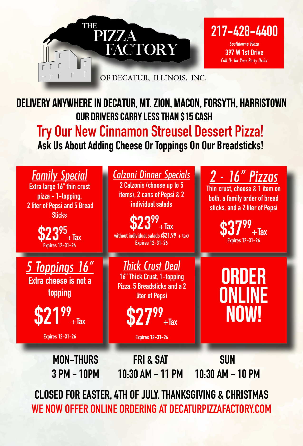 Decatur Pizza Factory is owned and operated by Josh Crawford. Our mission is to serve all of our customers to the best of our ability. Thank you for the opportunity to serve you!